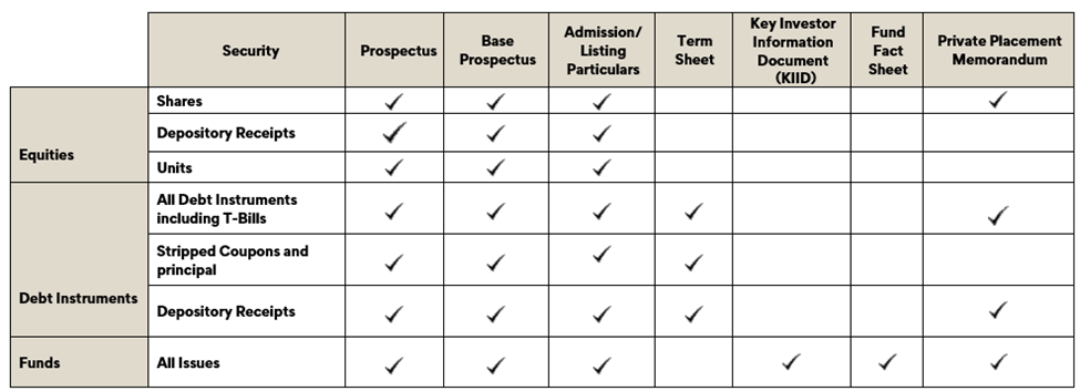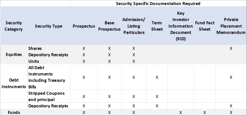 - Listing on and Exchange - include the Listing Particulars/Prospectus and listing approval from the relevant Exchange