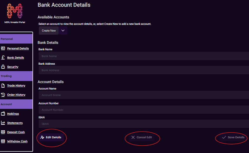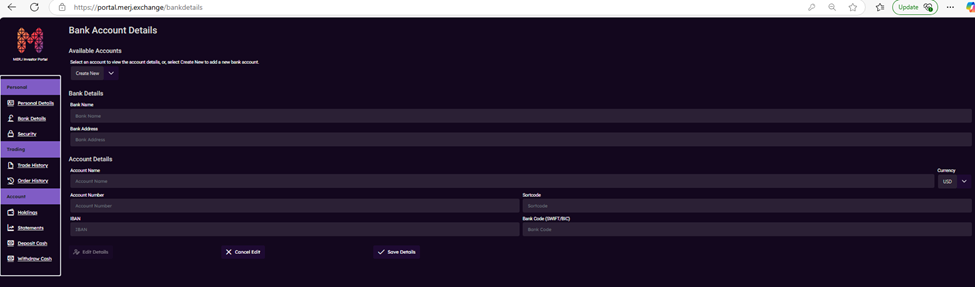 The Bank Details section in the Investor Portal (portal.merj.exchange) stores the bank account information recognized for deposits and withdrawals. Follow these steps to manage your banking details.