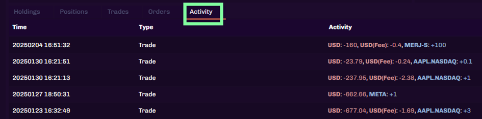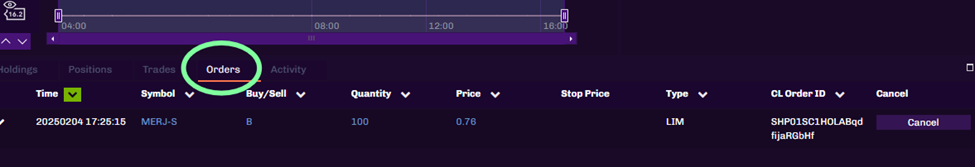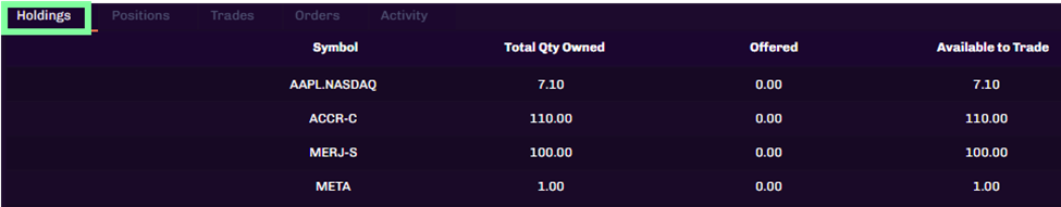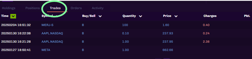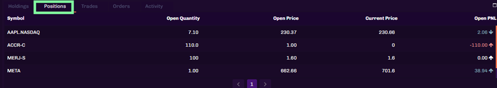 - Positions: Shows Open Quantity, Open Price, Current and Open PNL.